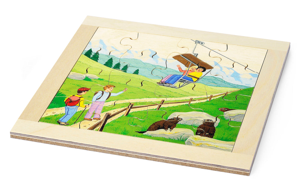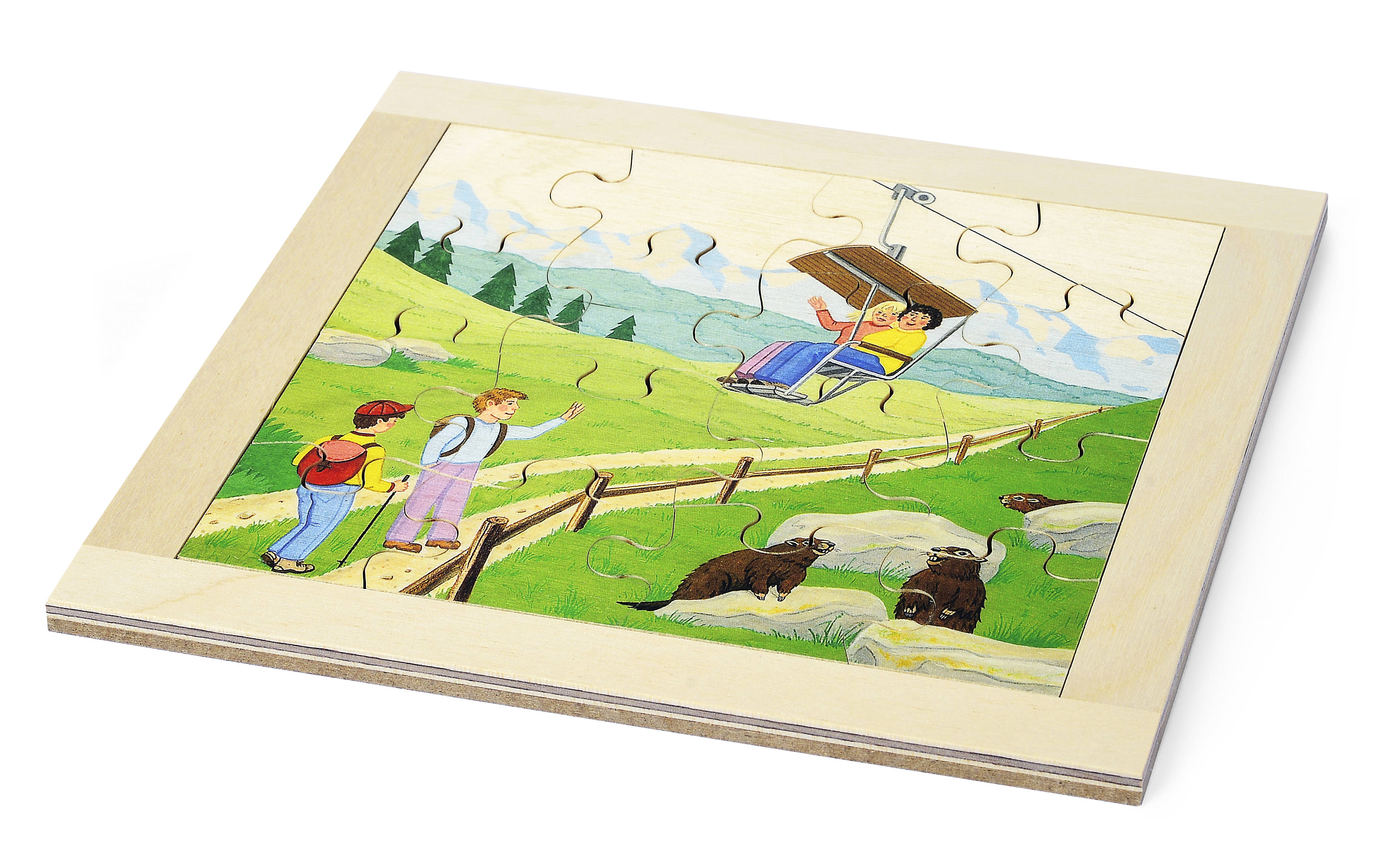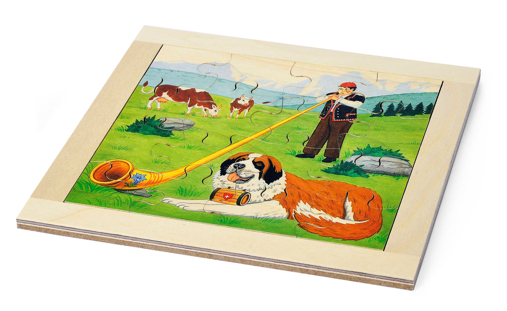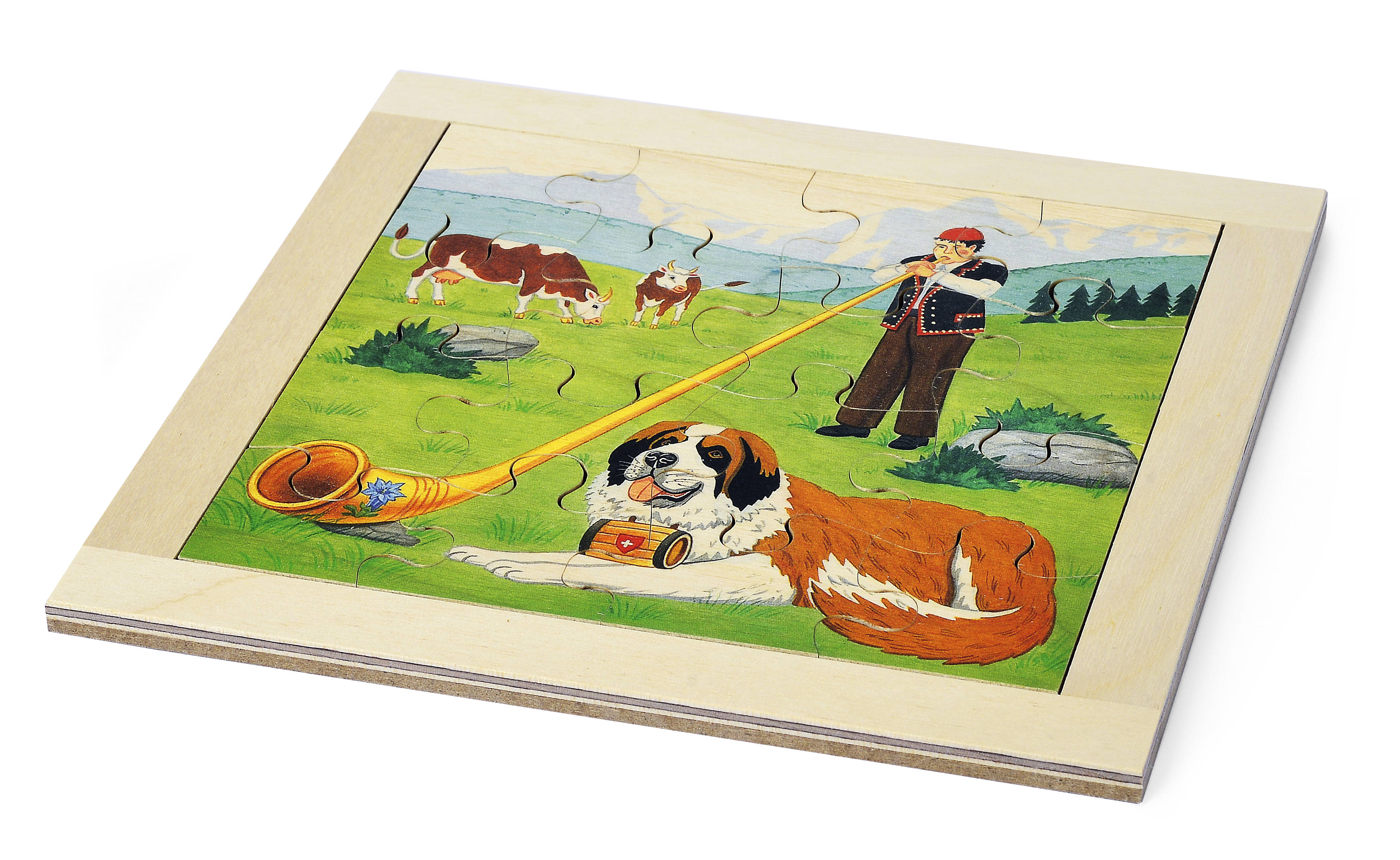 Dieses 16-teilige Holzpuzzle "Swiss" gibt es in 4 verschiedenen Motiven.